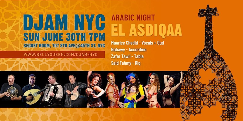 تقدم Djam في نيويورك أمسية شاعريّة يوم 30 حزيران في السّاعة السّابعة مساء والتي سيتم إقامتها في Djam NYC Arabic Night in the Secret Room NYC, 707 8th Ave, New York, NY 10036 (بين الشارعين 44 و45)، حيثُ ستأخذكم في رحلة خلابّة عبرَ الموسيقى والرقص التقليدي من تراث الشَّرق الأوسط.
