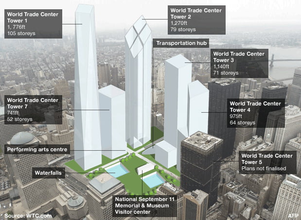 مخطط لجميع الأبنية الجديدة تبلغ التكلفه الإجمالية للمشروع 25 مليار دولار مركز المواصلات الجديد الذي يربط خطوط القطارات بن نيويورك و نيوجرسي. بلغت تكلفة هذا المركز ما يزيد عن 4 مليارات دولار وهو ضعف التكلفة التقديرية طابق الزوار في أعلى برج التجارة الرئيسي. زاره ما يزيد عن 2.3 مليون زائر العام الماضي مركز الزوار ومتحف 9/11 Performing Art Center سيتم افتتحه في 2021 وستبلغ تكلفته الجمالية 243 مليون دولار وأخيراً، أكبر شلالين من صنع الإنسان في أمريكا لتخليد ذكرى برجي التجارة العالمي الذين تدمر في أحدث 9/11 الإرهابية